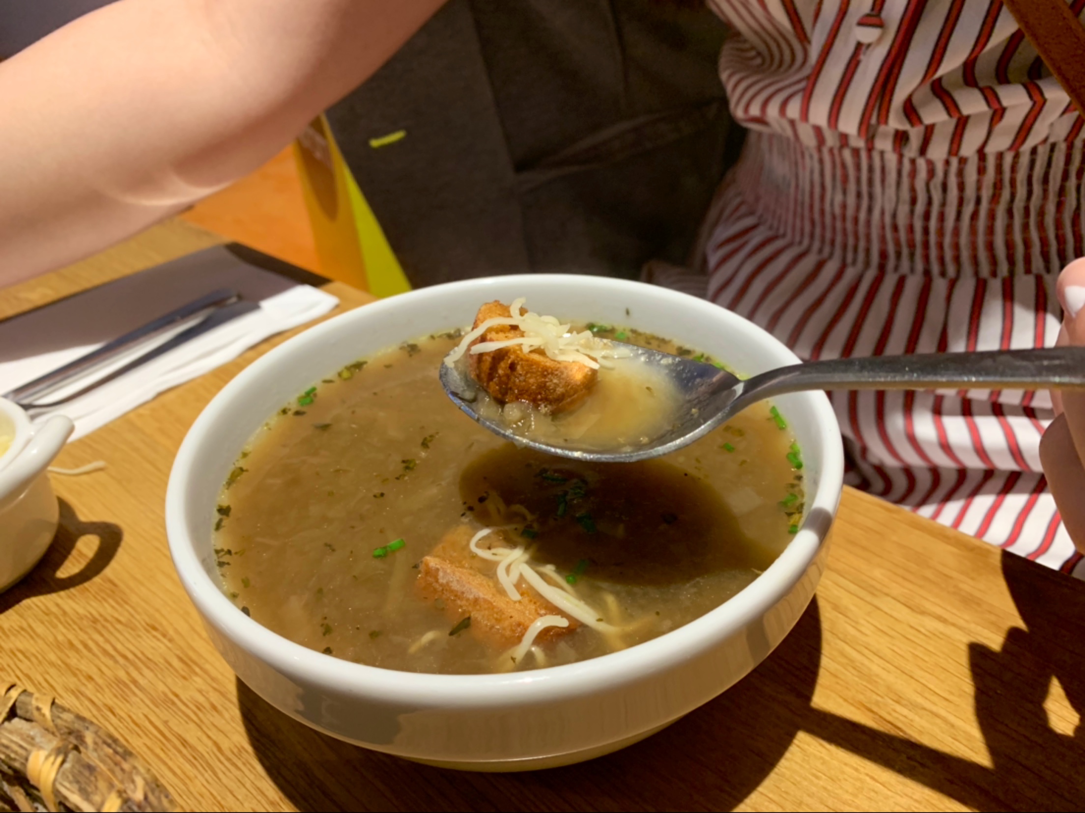 J'ai apprécié mon déjeuner ici composé d'une soupe à l'oignon française et d'une assiette de charcuterie, la dame était également super sympa