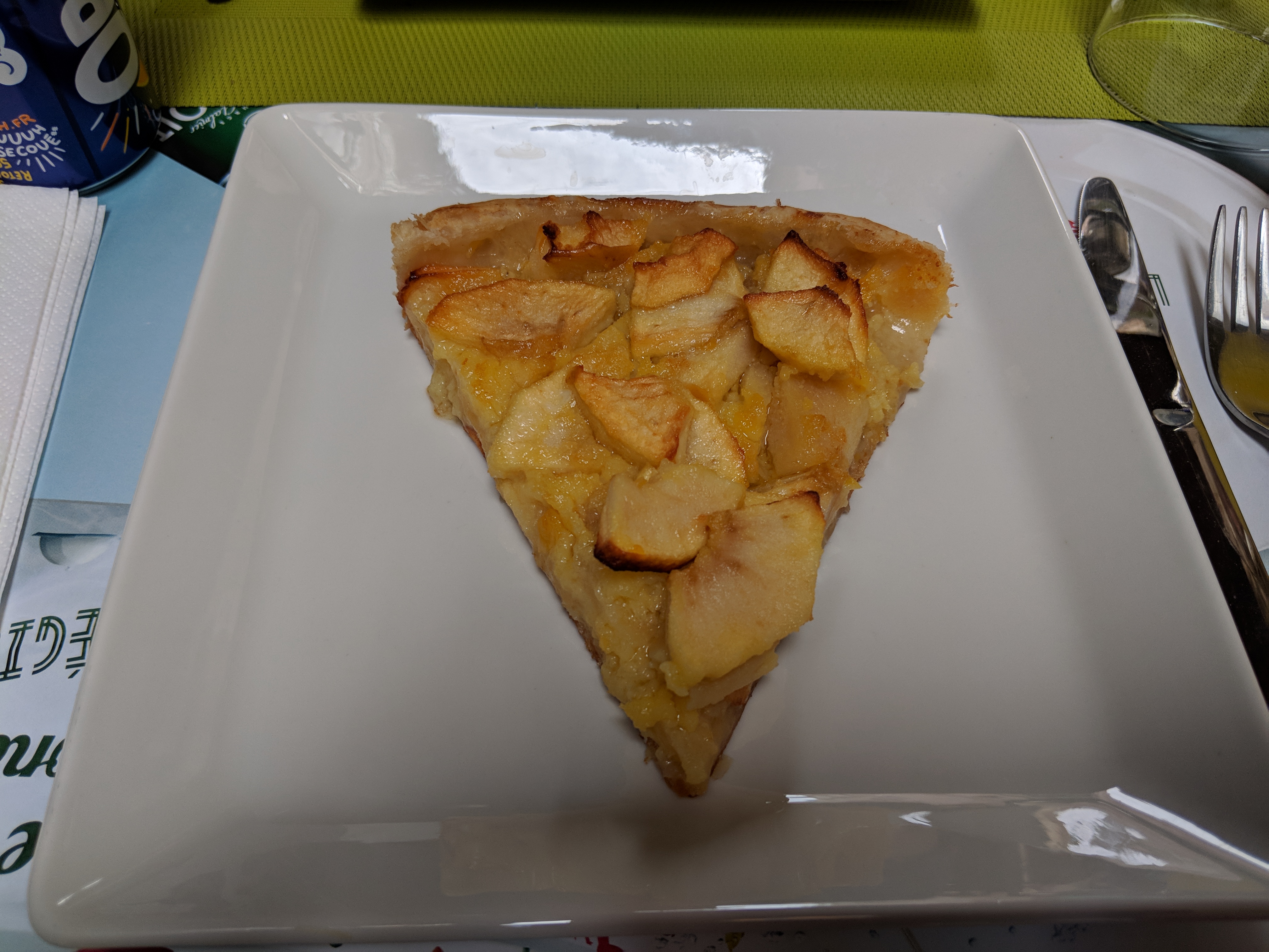 Excellente tarte aux pommes et au citron. J'ai également mangé de la bonne soupe de courgettes, curry, poulet, mozzarella et de la raclette.