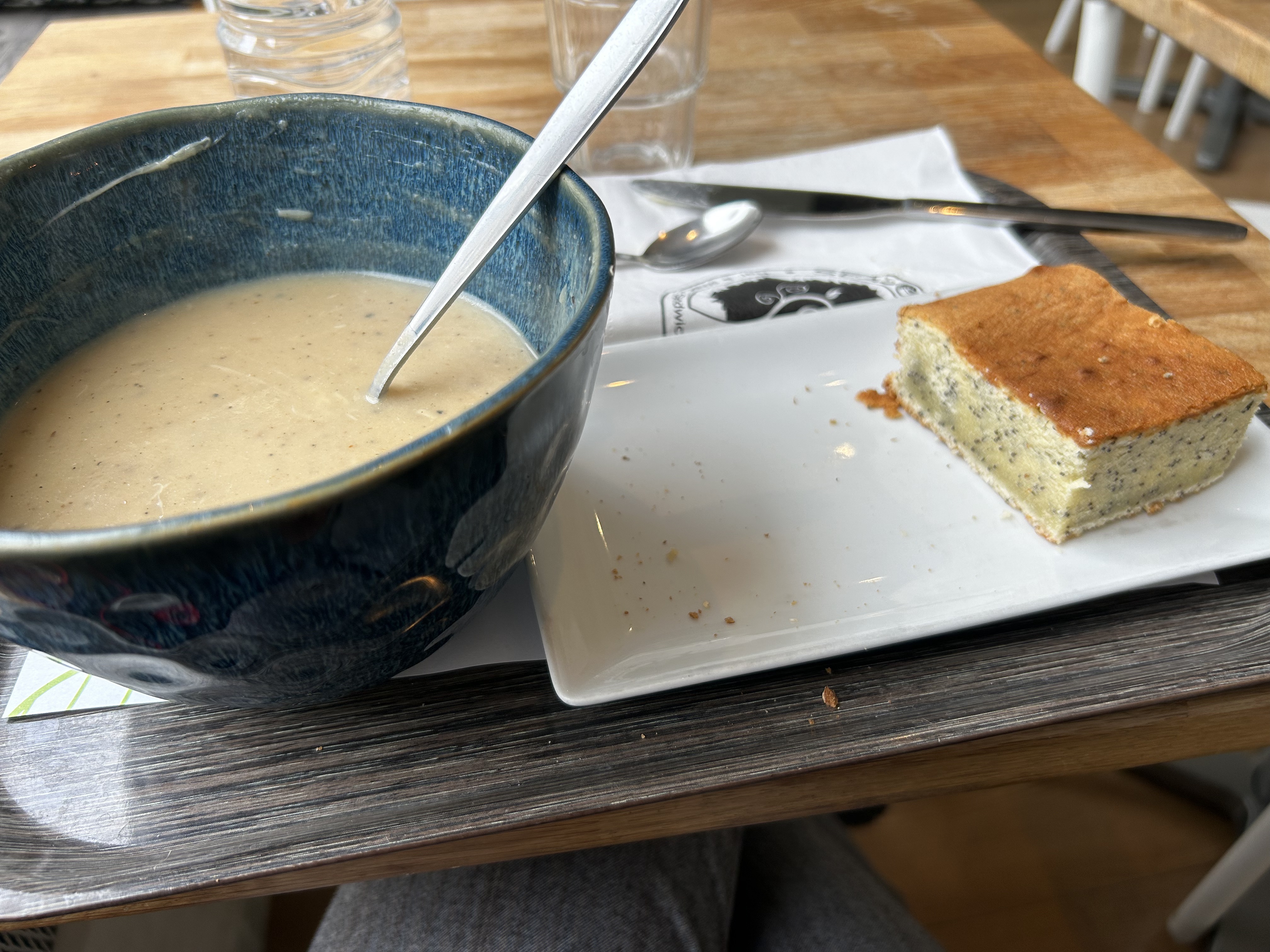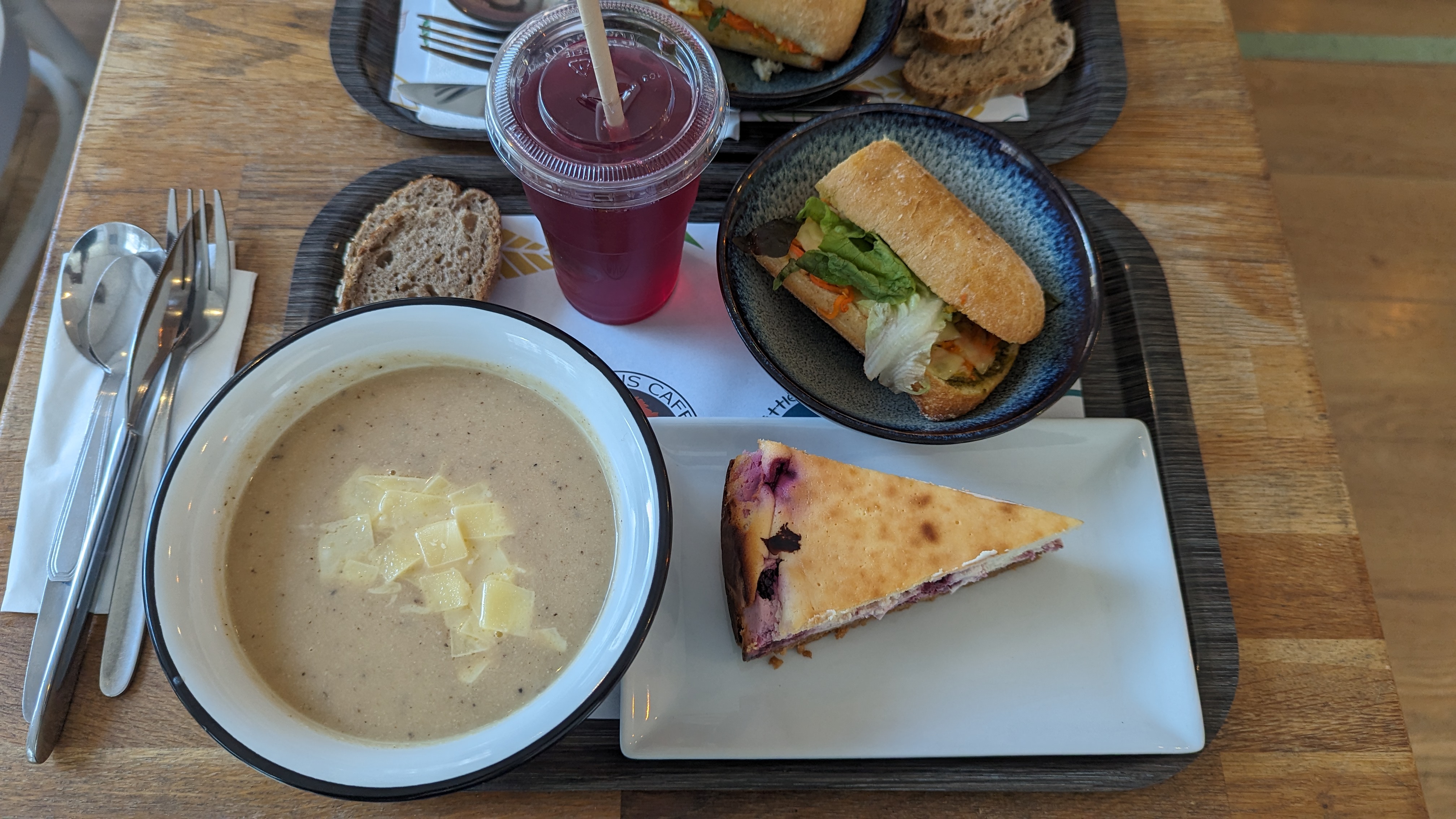 Grand choix de soupes et de sandwichs à des prix raisonnables. 9 € pour une grande soupe et un gâteau. Le cheesecake était incroyable 😋