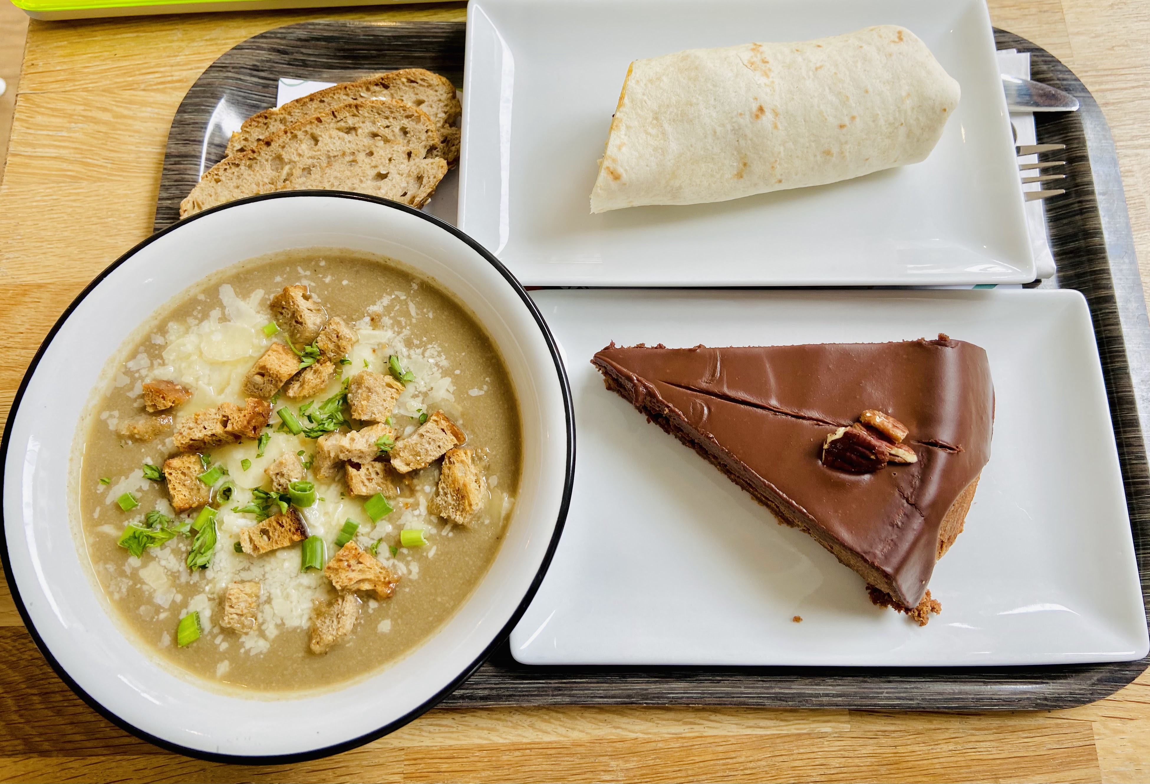 J'ai pris une formule Good+ Elle comprend : une soupe, 1/2 club ou quiche, un dessert 4 choix de soupes, 3 de clubs, et un bonne dizaine de desserts. Tout est très très bon, et consistant. Vous avez du pain aux céréales servi avec la soupe, et à disposition des herbes, Parmesan, gruyère, croûtons, et une carafe d'eau. Je recommande vivement cette adresse 👌